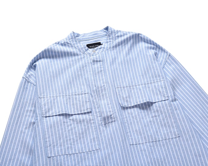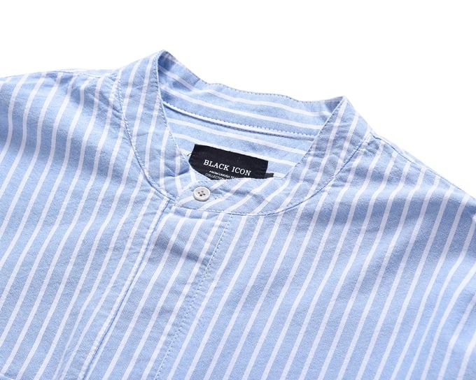 A camisa apresenta um design único sem gola que adiciona um toque contemporâneo a um silhueta clássica. Disponível em um tom azul descolado, ela encarna a essência da cultura jovem com seu caimento relaxado, perfeito para passeios casuais e encontros descontraídos.